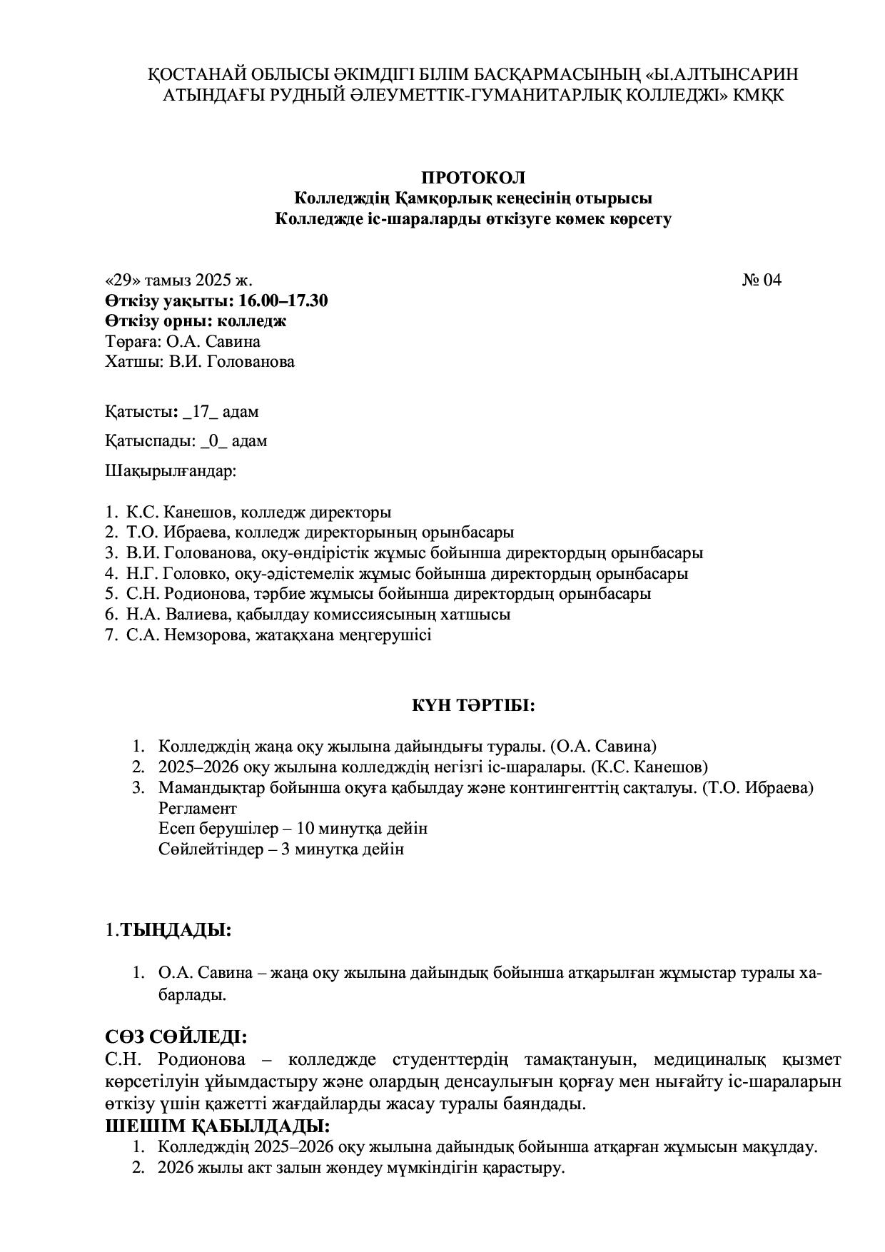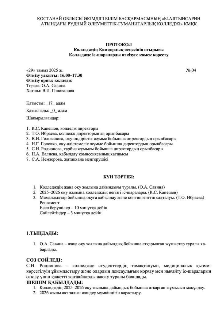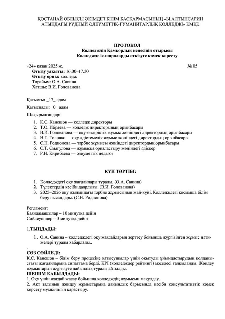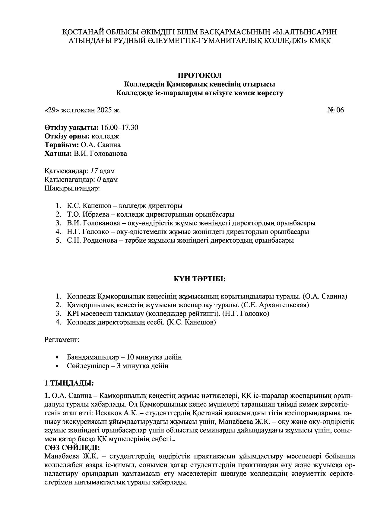«Ы. Алтынсарин атындағы Рудный әлеуметтік-гуманитарлық колледжі» КМҚК-де Қамқоршылық кеңесі құрылды. Бұл кеңестің төрағасы болып Рудный қаласы әкімдігі «Рудный қалалық білім бөлімі» ММ-нің жетекшісі К.С. Канешов тағайындалды. Кеңестің бірінші отырысы 12 қыркүйекте өтті, кездесудің тақырыбы «Болашаққа бағдар – рухани жаңғыру» – «Взгляд в будущее – модернизация общественного сознания» бағдарламасын жүзеге асыру, сонымен қатар колледждің 100 үздік студенті байқауын бастау идеясы.